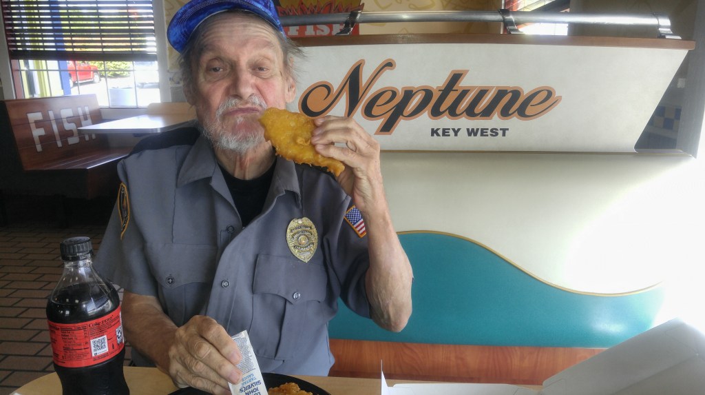 After Walmart we went to Long John Silver’s. On the way, he told me his daughter told him not to wear the security guard uniform. He told me a long time ago he was the nighttime security guard for a black church down in Florida and that’s where the shirt and the badge were from.
