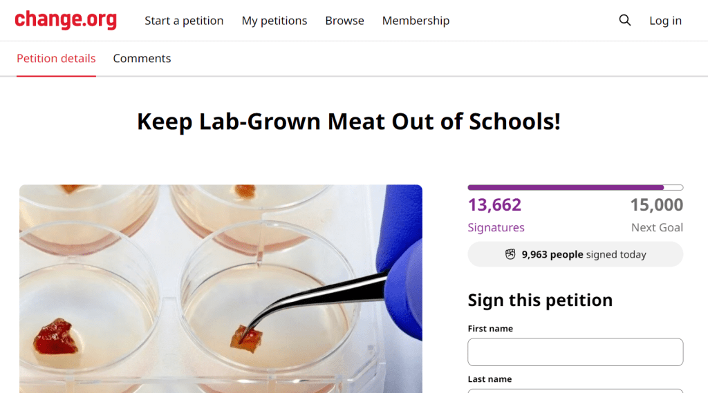 There’s an online petition to stop lab-grown meat from being served in schools.